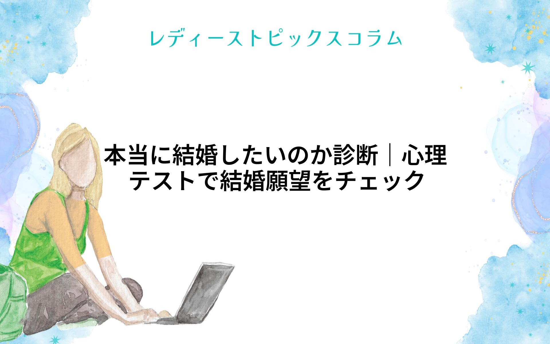 「結婚したい気持ちはあるけれど、本当に自分は結婚を望んでいるの?」と悩む女性は少なくありません。人生の大きな選択だからこそ、心の奥底にある本音を知りたいですよね。本当に結婚したいのか診断は、心理テストを通してあなたの結婚願望や適性、理想... -